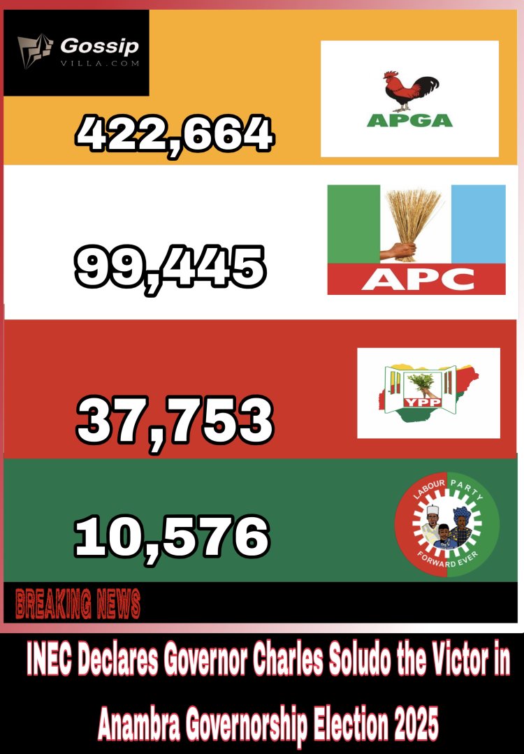 INEC declares Governor Charles Soludo of APGA the winner of the Anambra 2025 governorship election in a historic landslide, securing all 21 LGAs with 422,664 votes amid peaceful polls and widespread jubilation.