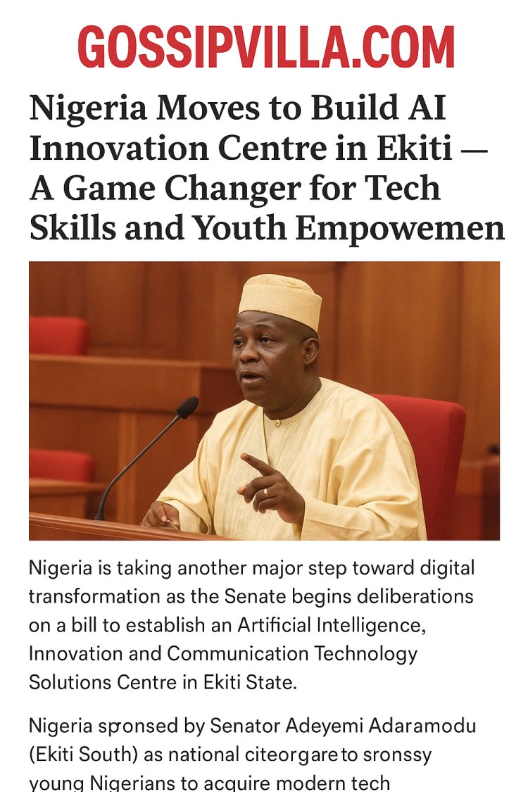 Nigeria is taking another major step toward strengthening its digital economy as the Senate begins consideration of a new bill to establish an Artificial Intelligence, Innovation, and Communication Technology Solutions Centre in Ekiti State. The proposed centre, sponsored by Senator Adeyemi Adaramodu representing Ekiti South, aims to position Nigeria as a leading hub for artificial intelligence, robotics, and data-driven innovation across Africa.